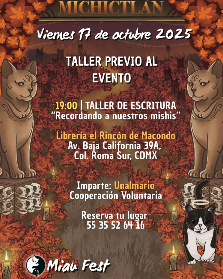Podrás disfrutar de pasarelas de adopción de gatos, concursos de disfraces felinos, zonas de fotografía, bazares temáticos, talleres de arte, gastronomía vegana y productos exclusivos para gatos. Además, habrá espectáculos inspirados en la cultura mexica y el Mictlán, con música, performances y ambientaciones relacionadas con los nueve niveles del inframundo.