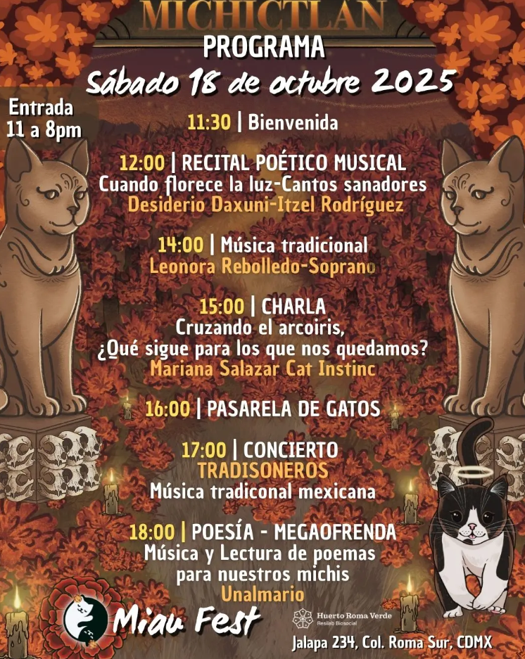 El Miau Fest 2025 regresa a la CDMX con la edición “Mictlán”, inspirada en el mítico inframundo mexica. El festival de gatos se realizará los días 18 y 19 de octubre en el Huerto Roma Verde, ubicado en Jalapa 234, colonia Roma Sur, Cuauhtémoc, CDMX. Una combinación de cultura prehispánica, arte y el amor por los gatos. La opción ideal para toda la familia, con actividades, adopciones y talleres.