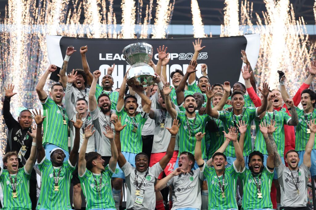 SEATTLE, WASHINGTON – AUGUST 31: Cristian Roldan #7 of the Seattle Sounders FC lifts the Champion’s trophy after winning the Leagues Cup Final match between Seattle Sounders and Inter Miami CF at Lumen Field on August 31, 2025 in Seattle, Washington. (Photo by Steph Chambers – Leagues Cup/MLS via Getty Images)