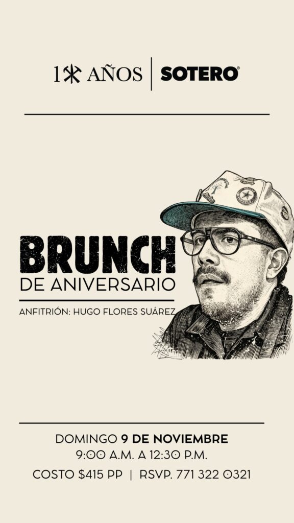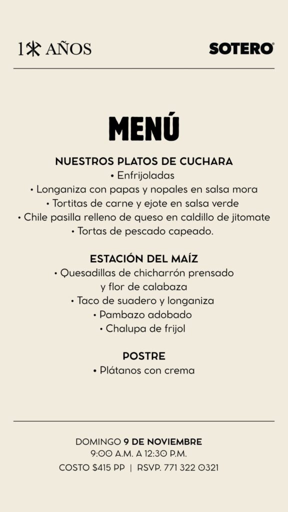 Para conmemorar su décimo aniversario, Sotero ofrecerá un menú de festejo donde cada velada será liderada por distintos cocineros del equipo titular, quienes compartirán sus recetas únicas. La primera celebración será el domingo 9 de noviembre, con un brunch que incluye enfrijoladas, longaniza con papas y nopales en salsa mora, chile pasilla relleno, pescado capeado y quesadillas, con un costo de 415 pesos por persona.