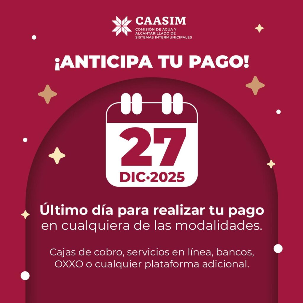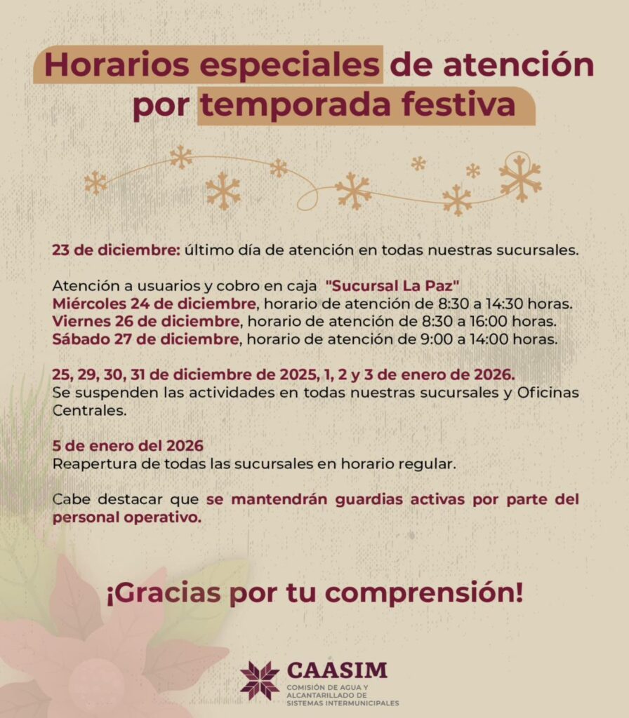 La Comisión de Agua y Alcantarillado de Sistemas Intermunicipales (Caasim) dio a conocer, a través de un comunicado en sus redes sociales, la modificación de sus horarios con motivo de las festividades decembrinas.