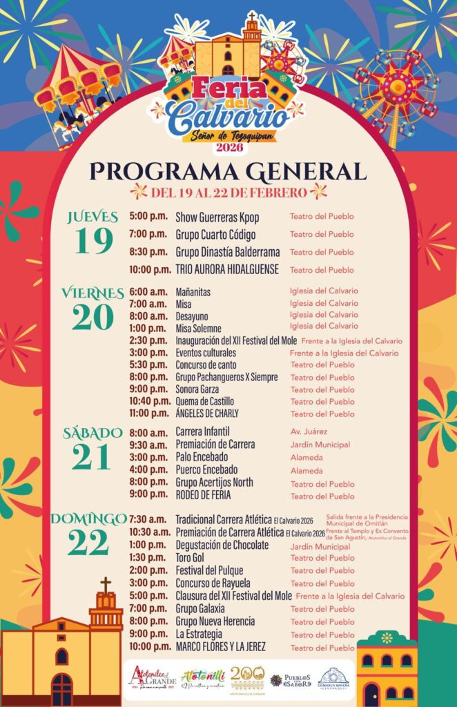 Otra de las celebraciones más buscadas en febrero es la Feria del Calvario en Atotonilco El Grande, famosa por su ambiente familiar, música, actividades y su riqueza gastronómica.