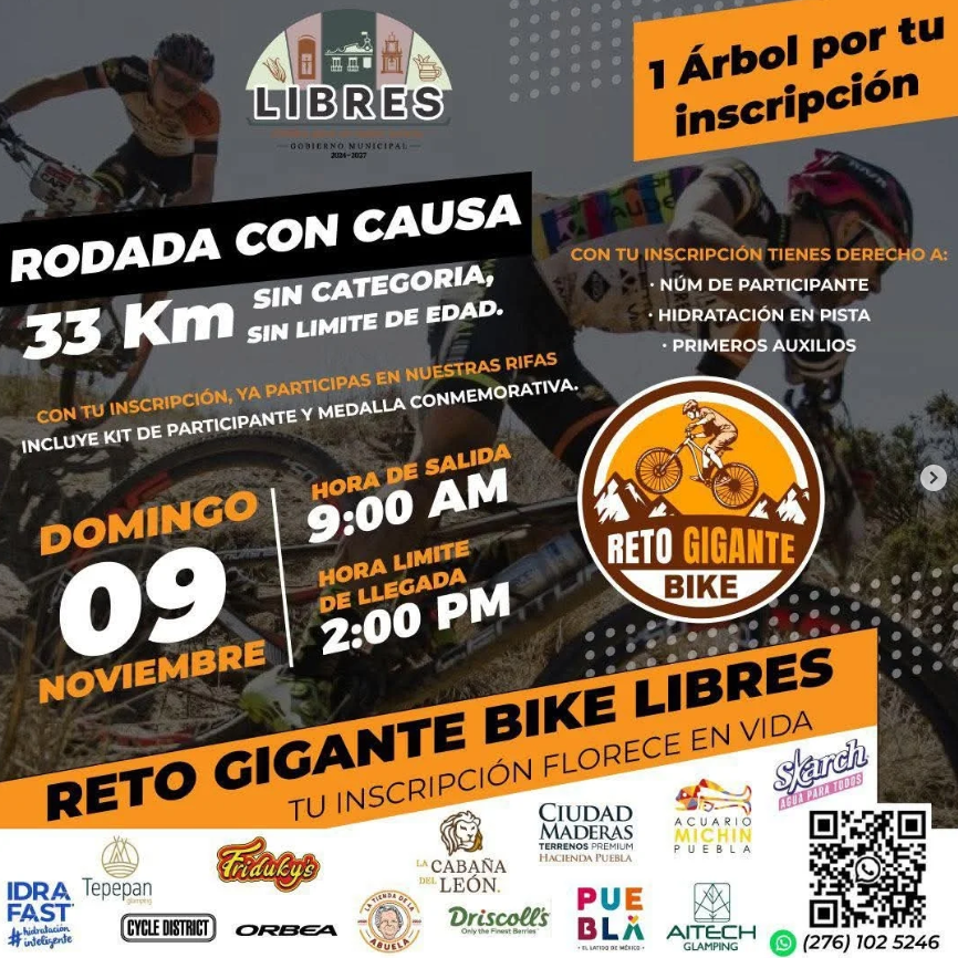 Los interesados pueden sumarse como participantes o patrocinadores comunicándose al (276) 102 5246. Cada kilómetro recorrido en Libres no solo se traduce en ejercicio, sino en comunidad y en árboles que marcarán la diferencia. El Reto Gigante Bike 2025 demuestra que deporte, ecoturismo y responsabilidad social pueden unirse para transformar la experiencia de cada visitante y reforzar la identidad de un municipio comprometido con su gente y su naturaleza.