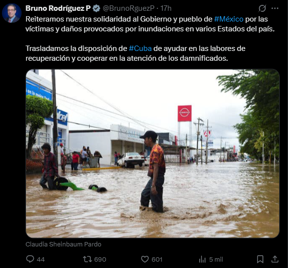 Desde La Habana, el presidente Miguel Díaz-Canel también expresó su apoyo a México tras la emergencia provocada por las lluvias. El canciller cubano, Bruno Rodríguez Parrilla, reiteró el mensaje de solidaridad con el Gobierno y el pueblo de México, ofreciendo condolencias a las familias afectadas por las inundaciones.
