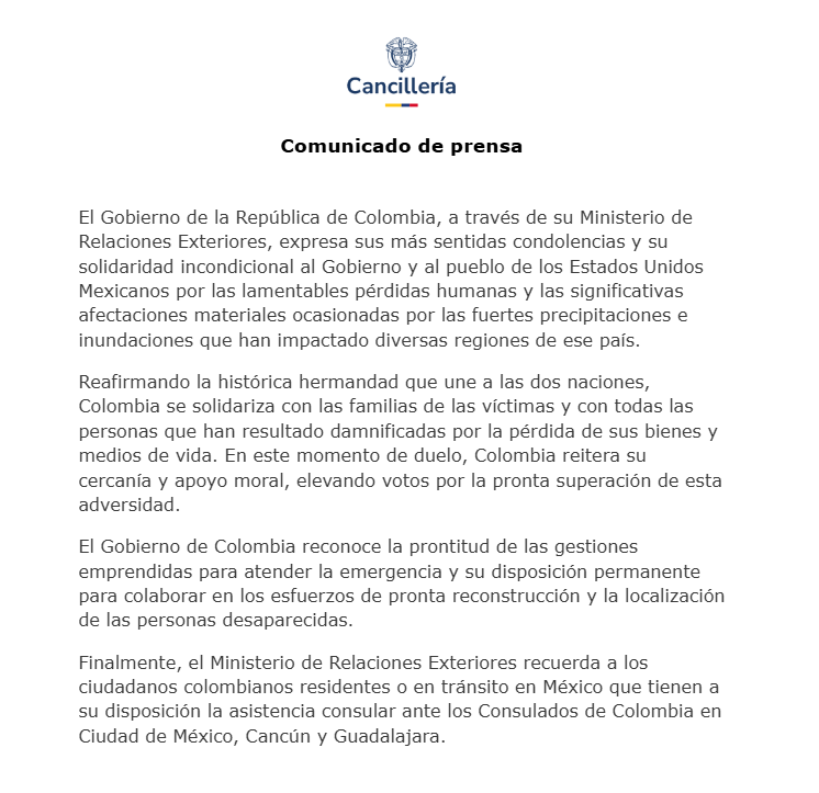 El Ministerio de Relaciones Exteriores de Colombia emitió un comunicado en el que manifestó sus “más sentidas condolencias y solidaridad incondicional” hacia México por las pérdidas humanas y los daños materiales ocasionados por las precipitaciones. La dependencia colombiana también envió un mensaje de respaldo a las familias de las víctimas y a las personas que perdieron sus bienes o medios de vida.
