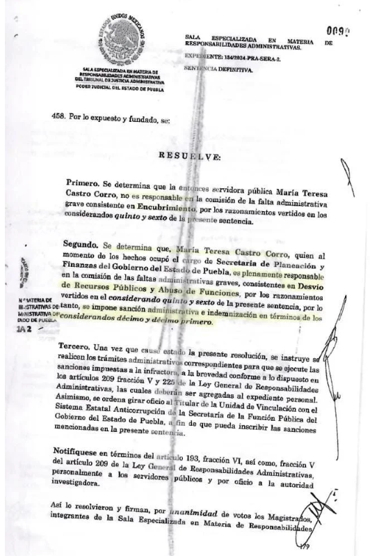 Multan e inhabilitan a exsecretaria de Finanzas de Puebla tras comprobarse su responsabilidad en una inversión fallida. El 27 de octubre de 2025, la Sala Especializada en Materia de Responsabilidades Administrativas del Poder Judicial del Estado resolvió que María Teresa Castro Corro incurrió en desvío de recursos públicos y abuso de funciones durante su gestión como titular de la Secretaría de Planeación y Finanzas en el gobierno de Miguel Barbosa Huerta.