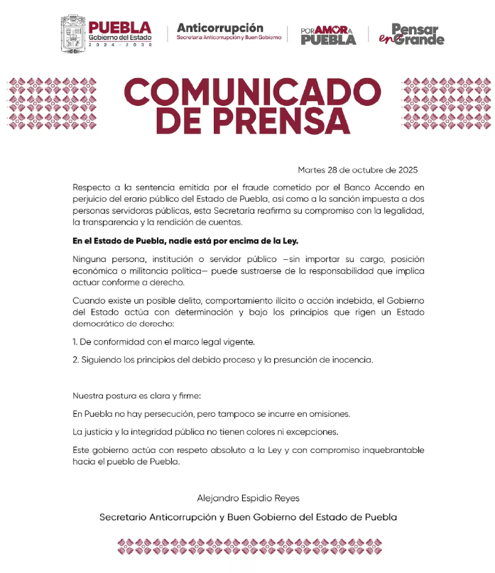 El subsecretario de Egresos de la Secretaría de Planeación y Finanzas de Puebla, José Enrique Girón Zenil, recibió una sanción histórica por su participación en la inversión irregular de recursos públicos en Banco Accendo. El Tribunal de Justicia Administrativa del Poder Judicial del Estado (TJAEP) determinó inhabilitarlo por 15 años para ocupar cargos públicos y le impuso una indemnización de 241 millones 998 mil 452 pesos. La resolución responde al quebranto financiero generado durante el sexenio barbosista, considerado uno de los mayores desfalcos recientes en la entidad.