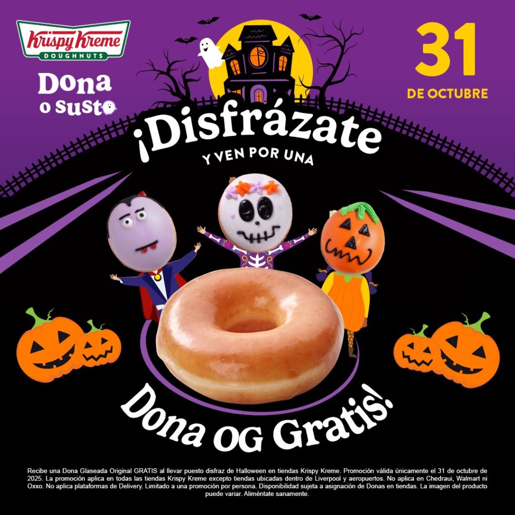 Durante todo el día, quienes acudan a cualquiera de sus sucursales en México caracterizados con un disfraz podrán recibir una dona glaseada original sin costo. La dinámica estará disponible únicamente el 31 de octubre de 2025, dentro del horario regular de atención, y aplica una dona por persona, sujeta a disponibilidad en cada punto de venta.