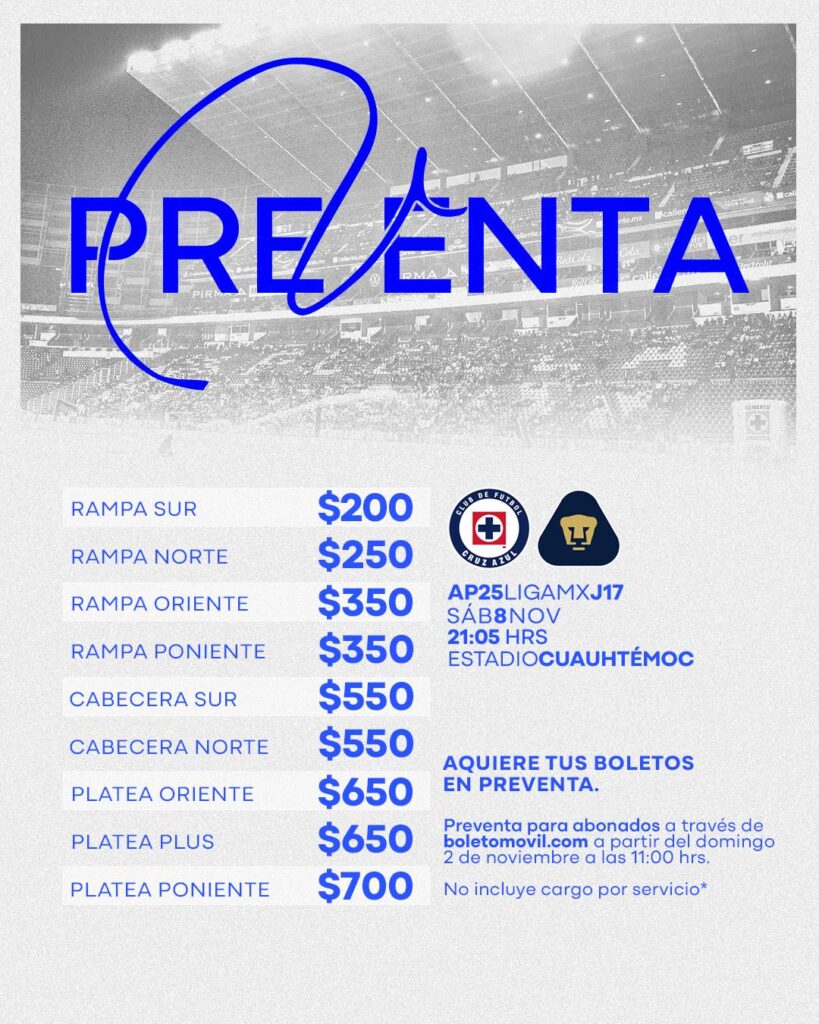 La directiva de Cruz Azul anunció una preventa exclusiva para abonados desde el domingo 2 de noviembre, con precios accesibles para todos los sectores del estadio. Los boletos se pueden adquirir a través del sitio www.boletomovil.com.